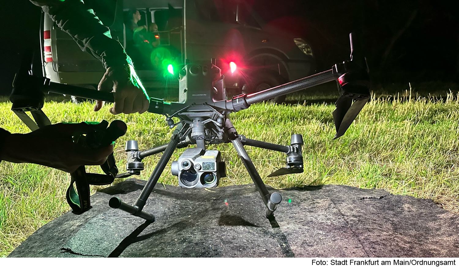 Um das Gebiet zielgerichtet mit der Drohne und einer hochauflösenden Kamera absuchen zu können, wurde es in verschiedene Flugraster aufgeteilt. Die Drohne wird von drei Personen aus einer Schaltzentrale in einem Transporter mit 15-Meter-Antenne gesteuert. Sehen die Expertinnen und Experten im Laufe dieser automatisierten Rasterbefliegung auf den Bildschirmen in der Schaltzentrale kleine weiße Punkte, so können sie manuell eingreifen, näher heranzoomen und anhand der Thermalsignatur erkennen, um welche Tierart es sich handelt.
